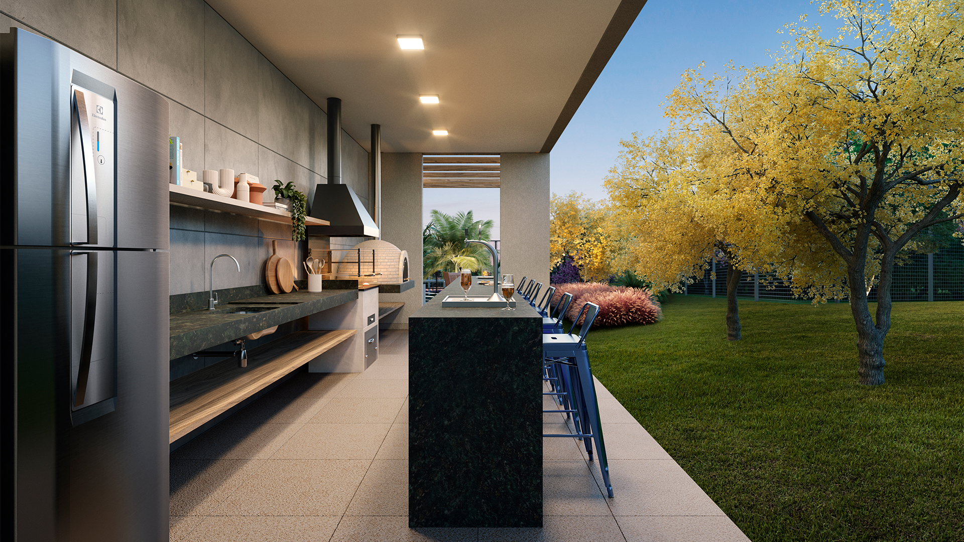 Imagens meramente ilustrativas, podendo sofrer alterações devido à rede elétrica não estar representada. Por se tratar de bem a ser construído, pode sofrer alteração sem aviso prévio. As perspectivas e ilustrações artísticas mostram ambientes e vegetação de porte adulto. Consulte memorial descritivo da sua unidade.